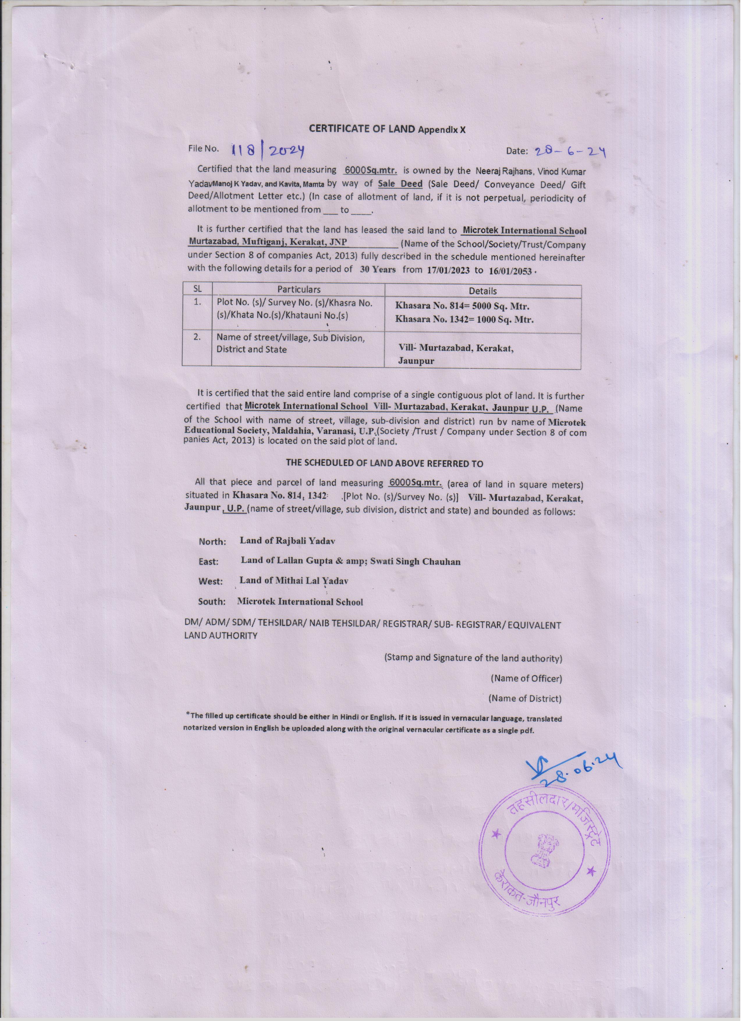 COPY OF THE DEO CERTIFICATE SUBMITTED BY THE SCHOOL FOR AFFILIATION/UPGRADATION/EXTENSION OF AFFILIATIONOR SELF CERTIFICATION BY SCHOOL |